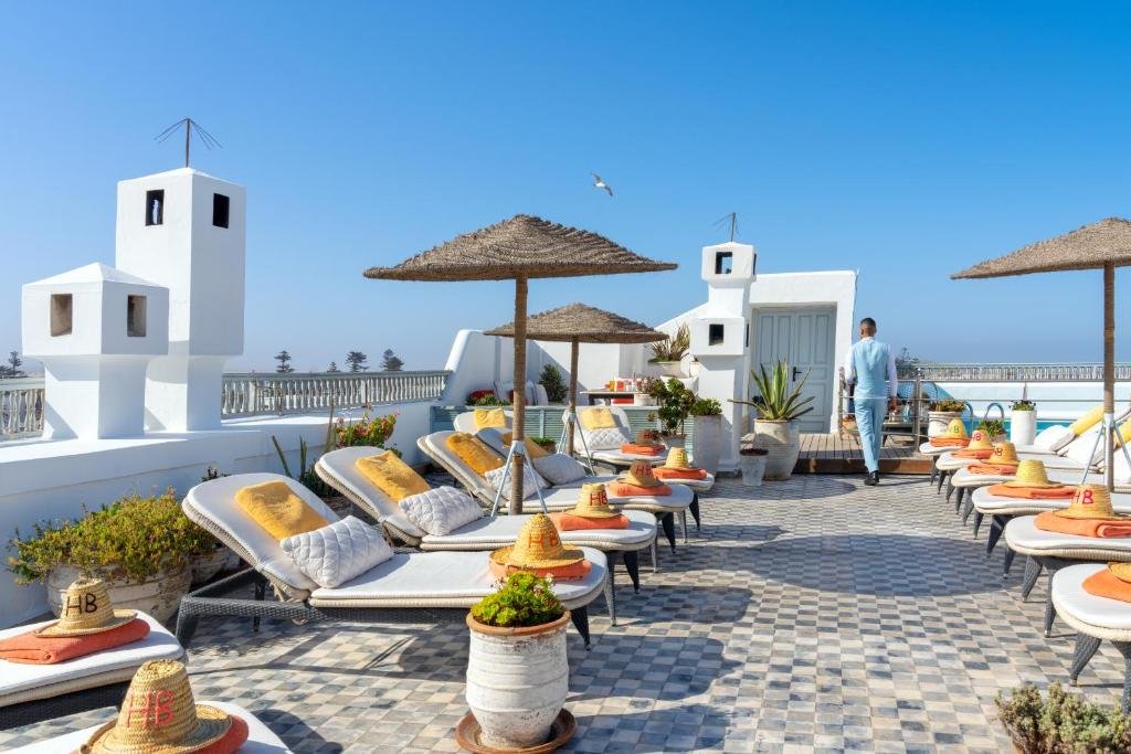 La terrasse emblématique de l’Heure Bleue Palais offre une vue panoramique exceptionnelle sur la médina et l’océan Atlantique. Sa piscine extérieure chauffée en fait un lieu idéal pour se détendre à tout moment de l’année. L’ambiance y est calme, élégante et parfaitement adaptée aux voyageurs souhaitant profiter d’un moment de sérénité tout en contemplant les paysages typiques d’Essaouira.