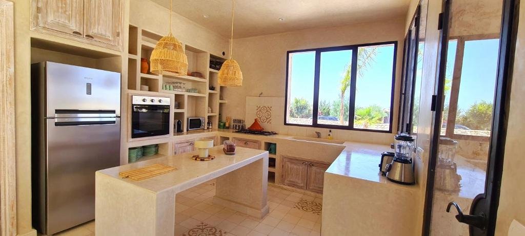 La cuisine entièrement équipée permet de préparer facilement tous vos repas. Elle comprend un réfrigérateur, un lave-vaisselle et tous les ustensiles nécessaires pour cuisiner dans un cadre agréable et fonctionnel. Pour compléter l’expérience, l’établissement propose un petit-déjeuner continental ou américain, idéal pour bien commencer la journée avant de partir explorer Essaouira et ses environs.