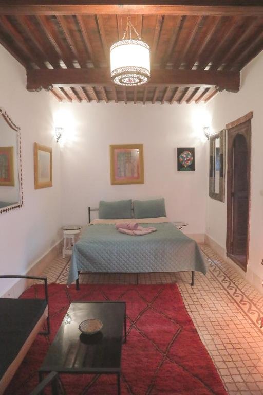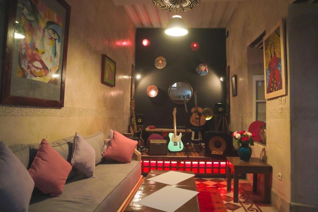 Les espaces communs incluent un salon cosy et un patio central, parfaits pour se détendre, lire ou partager un moment convivial avec d’autres voyageurs. Le riad propose également une cuisine équipée pour ceux qui souhaitent préparer leurs repas de manière autonome, ainsi qu’un Wi-Fi gratuit disponible dans tout l’établissement.