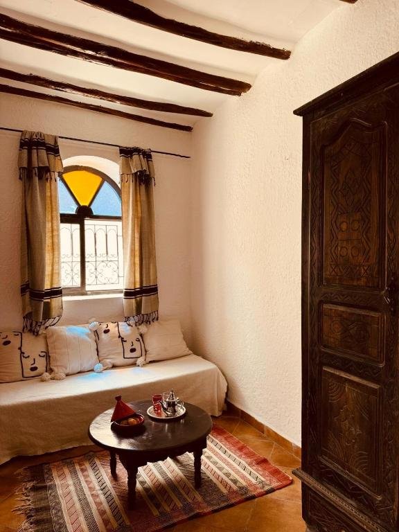 L’établissement se distingue par sa piscine extérieure entourée de transats, idéale pour se détendre sous le soleil d’Essaouira. La terrasse bien exposée permet de profiter d’un cadre calme et verdoyant. Les tables situées dans la cour centrale carrelée offrent un espace agréable pour savourer un repas ou boire un thé à l’ombre, tout en profitant d’une ambiance traditionnelle.