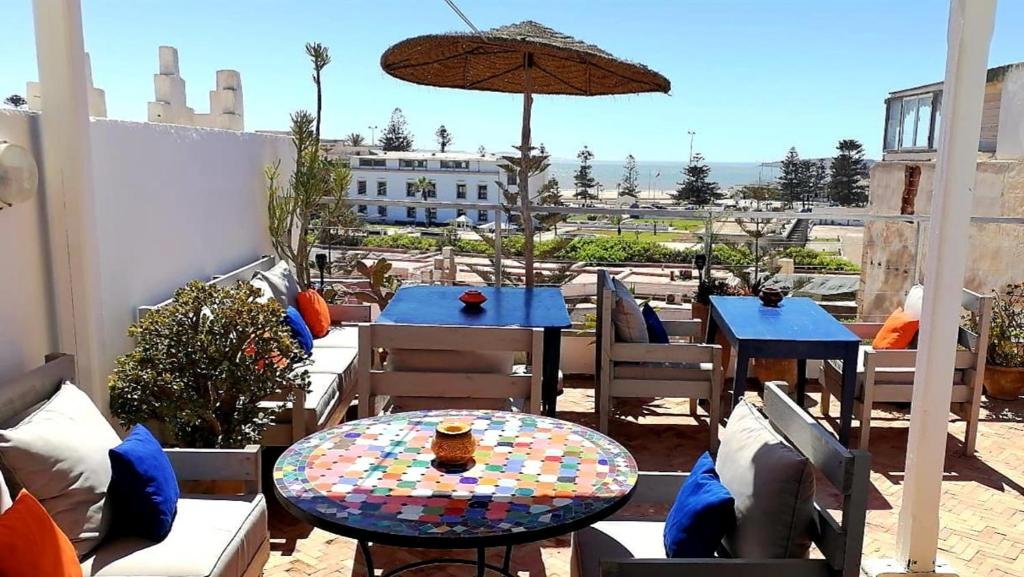 Chaque matin, les hôtes peuvent savourer un petit-déjeuner servi sur une terrasse à trois niveaux, offrant une vue spectaculaire sur la baie d’Essaouira, le port et l’île de Mogador — un moment privilégié pour commencer la journée en toute sérénité.