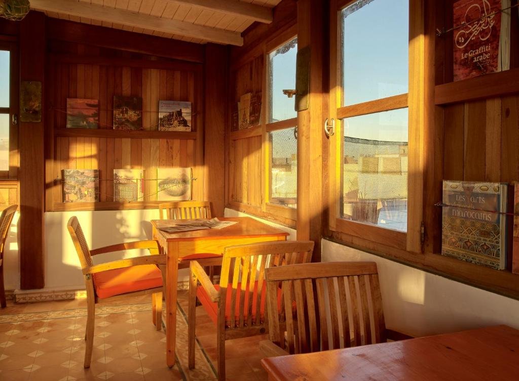 La salle à manger, ouverte sur le patio et le jardin, vous propose une cuisine marocaine simple et savoureuse, idéale pour découvrir les saveurs locales dans un cadre convivial.