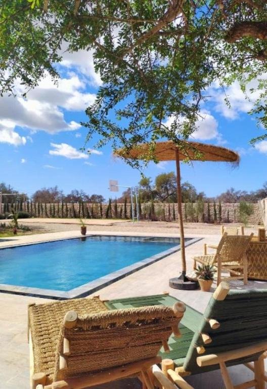 À l’extérieur, la Villa Bouzama se distingue par sa piscine extérieure, parfaite pour se rafraîchir lors des chaudes journées marocaines ou profiter de moments de détente en famille ou entre amis. Le jardin verdoyant entoure la villa, offrant un cadre paisible et agréable pour se promener, lire ou simplement profiter du soleil. La terrasse est un espace idéal pour savourer des repas en plein air ou profiter de la vue sur le jardin et la piscine, créant un cadre parfait pour des moments mémorables.