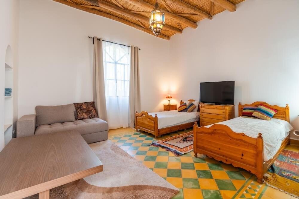 À l’extérieur, la villa séduit par son jardin verdoyant, sa terrasse ensoleillée et son balcon, parfaits pour profiter du climat doux d’Essaouira. La piscine privée est un véritable atout, invitant à la relaxation à tout moment de la journée, loin de l’agitation urbaine. Que ce soit pour un moment de repos, un déjeuner en plein air ou une soirée conviviale, les espaces extérieurs offrent un cadre idéal.